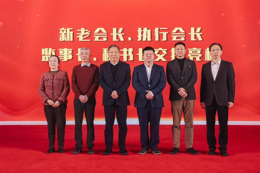 商会新老会长、监事长、秘书长上台进行交接亮相