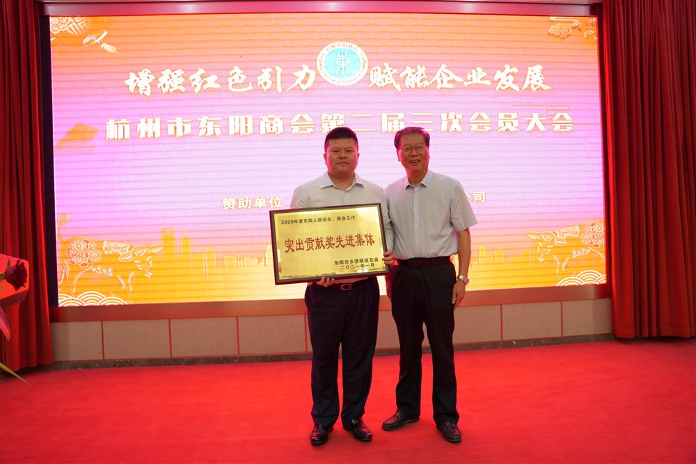 5月29日,东阳人乡贤联谊总会会长王正明给杭州东阳商会颁发“2020年度突出贡献奖先进集体