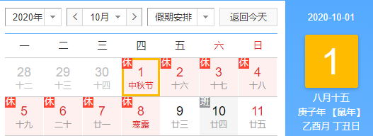 2020年 10 月 1 至 8 日放假,假期共计 8 天,10 月 9 日(周五)正常上班。