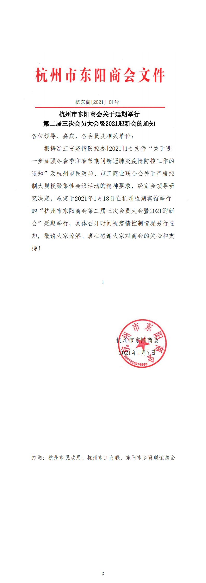杭州市东阳商会关于延期举行第二届三次会员大会暨2021迎新会的通知