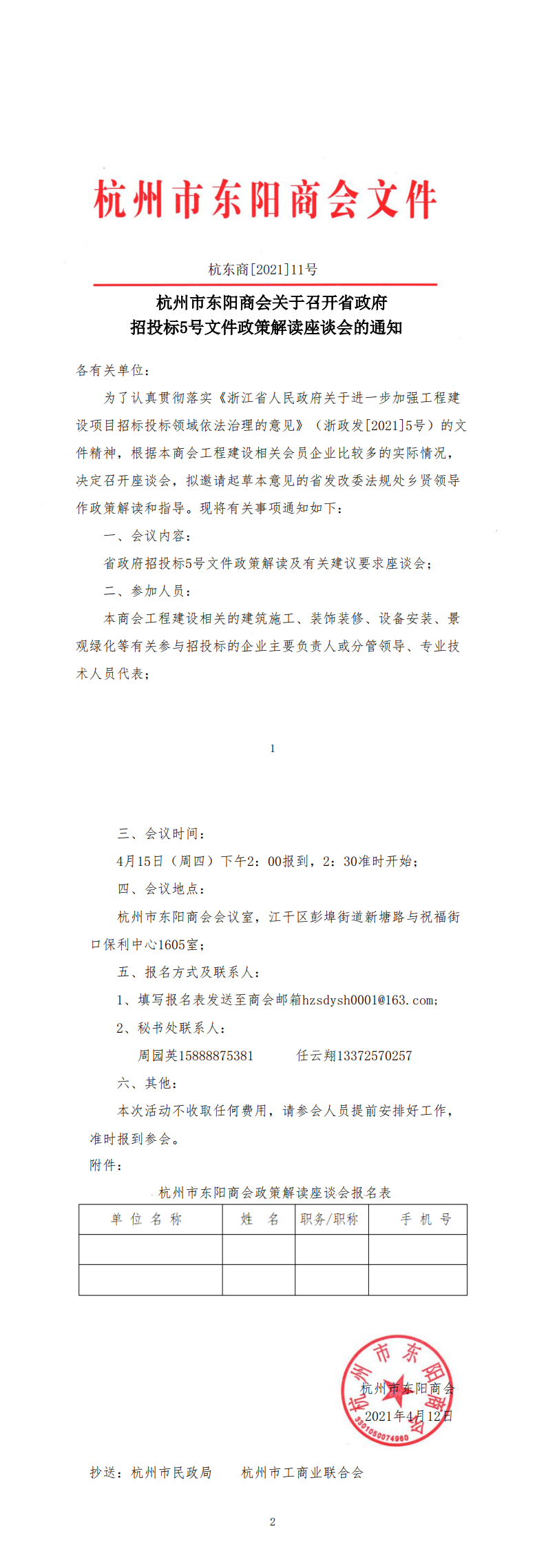 杭州市东阳商会关于召开省政府招投标5号文件政策解读座谈会的通知