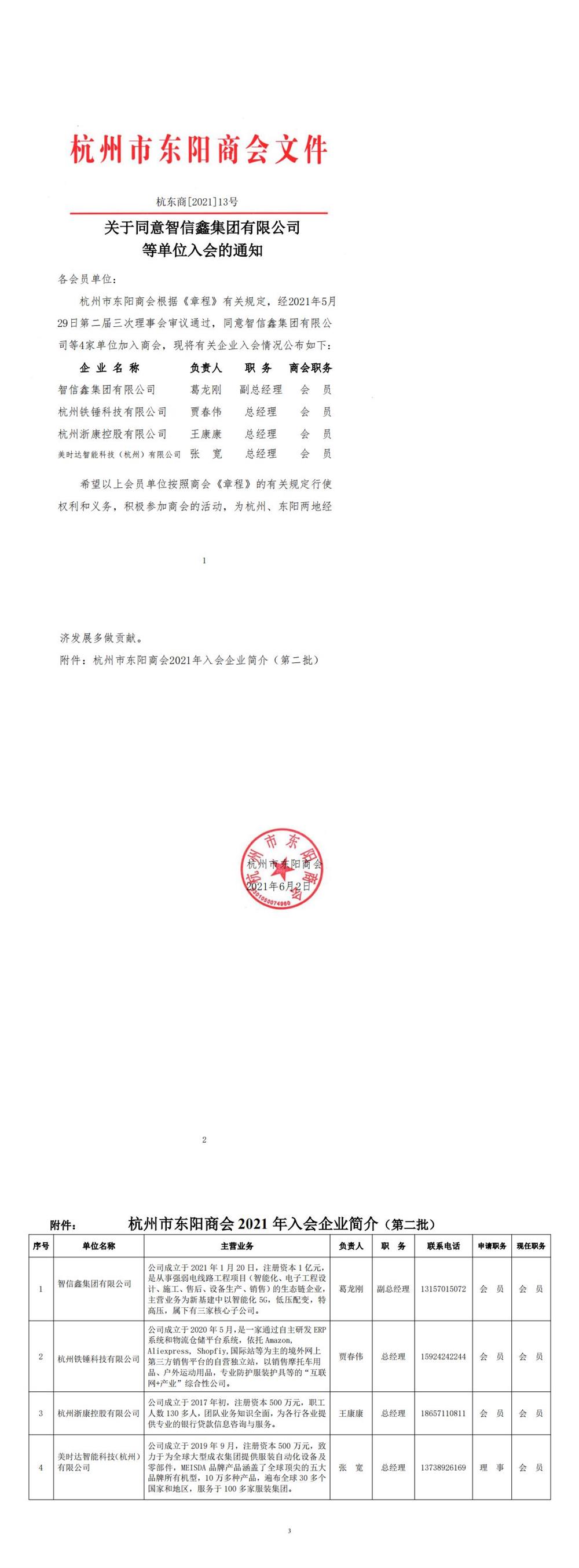 关于同意智信鑫集团有限公司等单位入会的通知