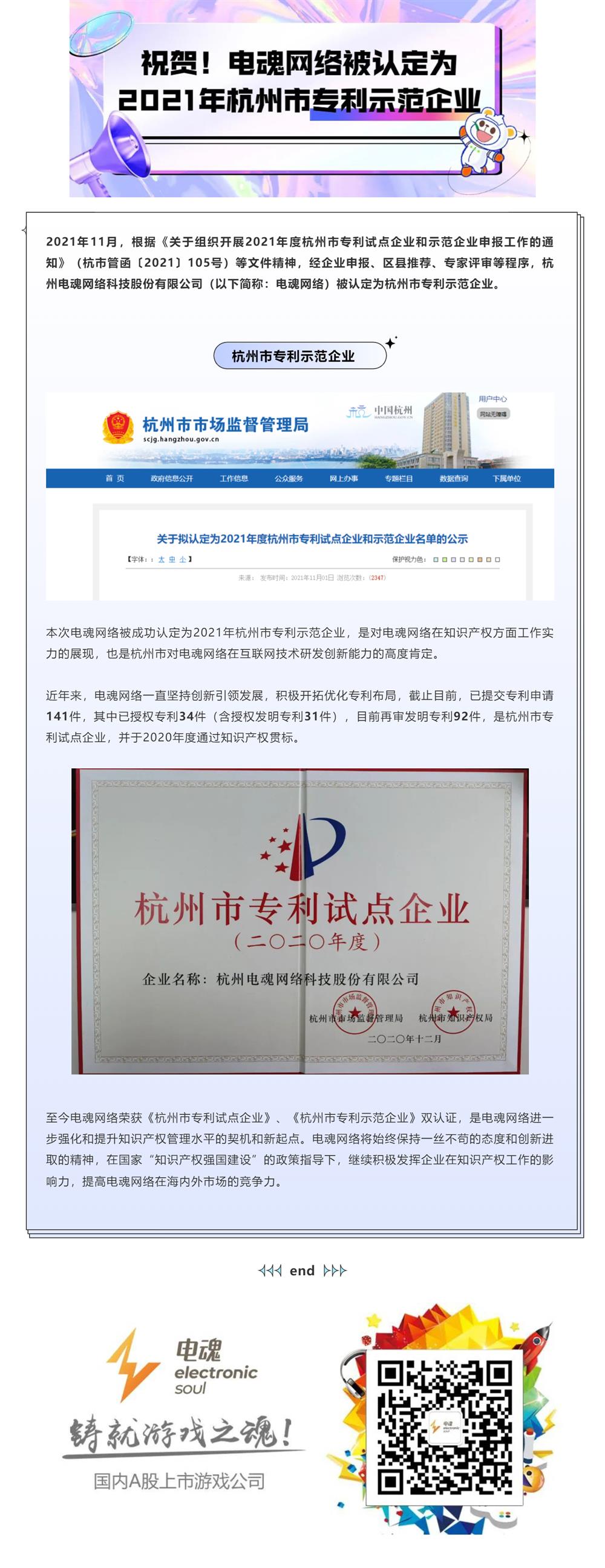 祝贺电魂网络被认定为2021年杭州市专利示范企业