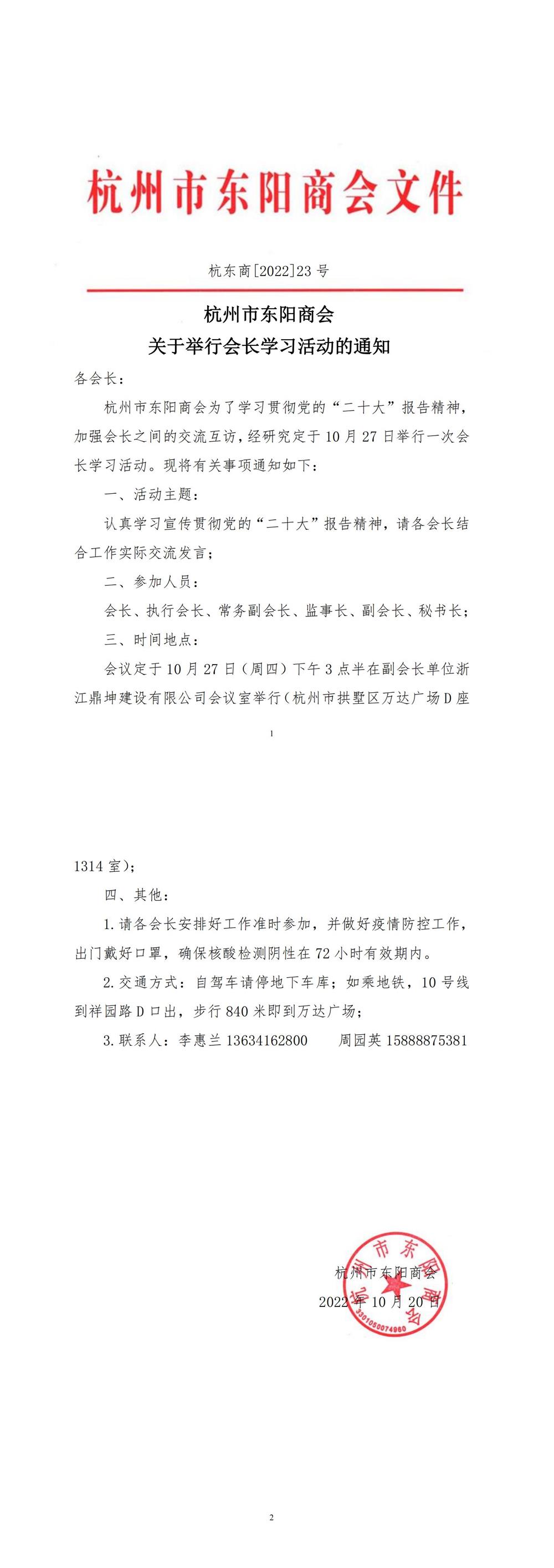 杭州市东阳商会 关于举行会长学习活动的通知