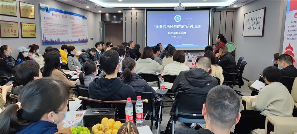 3月22日下午,“企业涉税风险防范”研讨培训活动在杭州市东阳商会会议室举行。商会会长单位中天控股、三方建设、康诺邦公司财务负责人,鼎磊加固金局民、北京国富会计师事务所胡伟良、中伦律师事务所陈鑫范、江天建设任晓丽、普华会计师事务所潘巧燕、中勤万信会计师事务所厉瑞强、正北实业徐必成、和义观达律师事务所卢江丽、耀胜通信李国银、星运集团胡思新、浙康控股王康康、方大通信陈良妹等主要负责人亲自参加学习,其他会员主管领导和财务人员50多人参加培训学习,会议室座无虚席。本次活动特别邀请了杭州市税务局第一稽查局副局长李越洁乡贤作专业指导,秘书处李惠兰主持会议。