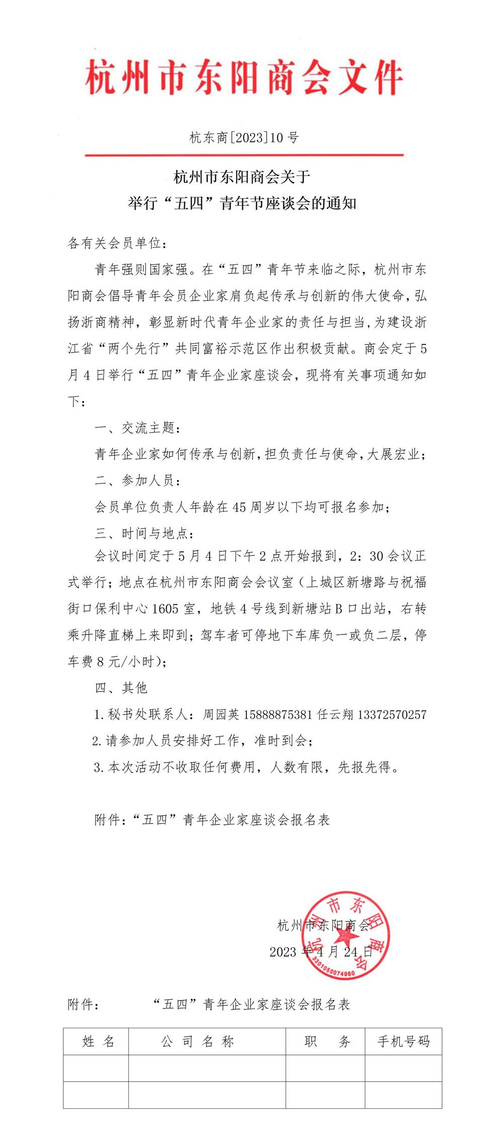 杭州市东阳商会关于举行“五四”青年节座谈会的通知