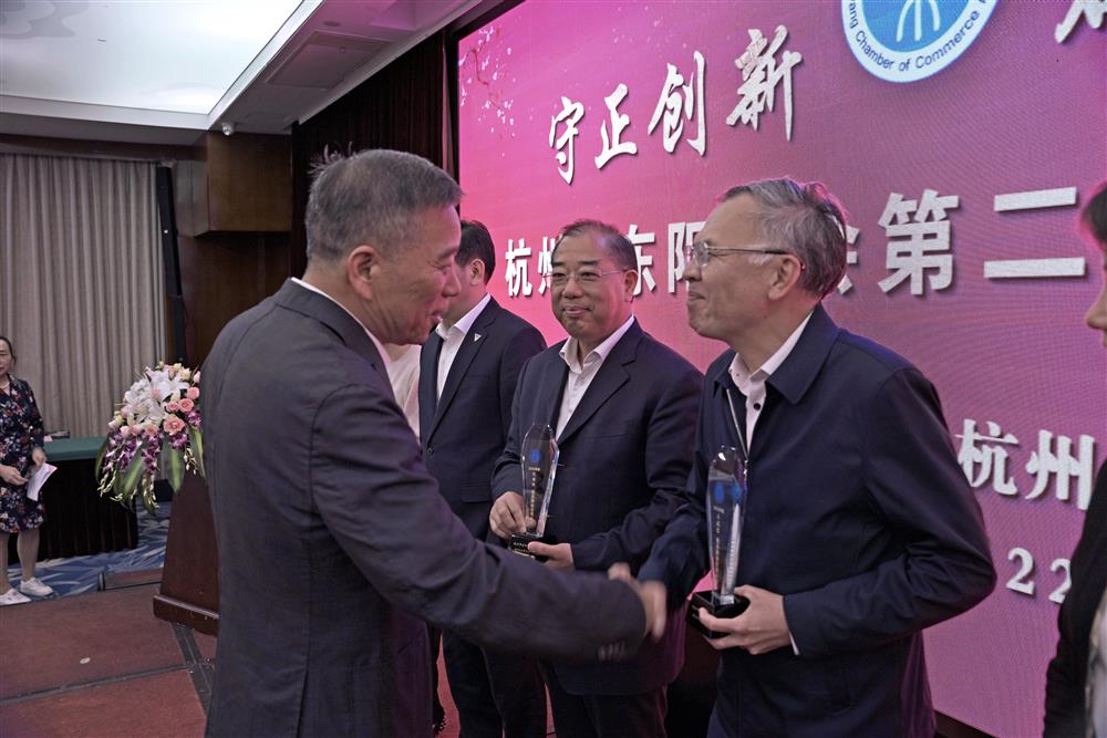 5月22日,会长楼永良给优秀乡贤颁发奖杯