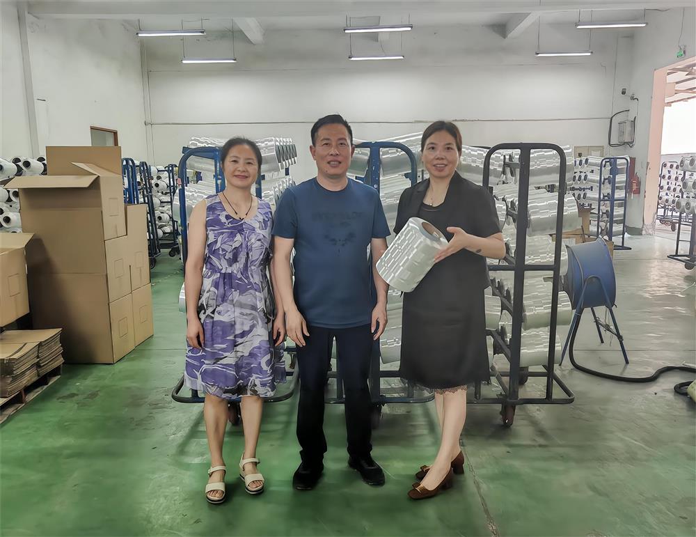 8月6日,周园英等与楼江伟董事长在永力隆特种纤维包装车间合影