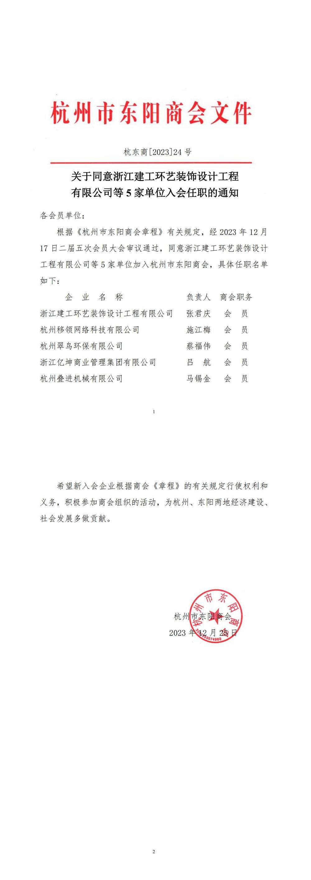 关于同意浙江建工环艺装饰设计工程有限公司等5家单位入会任职的通知