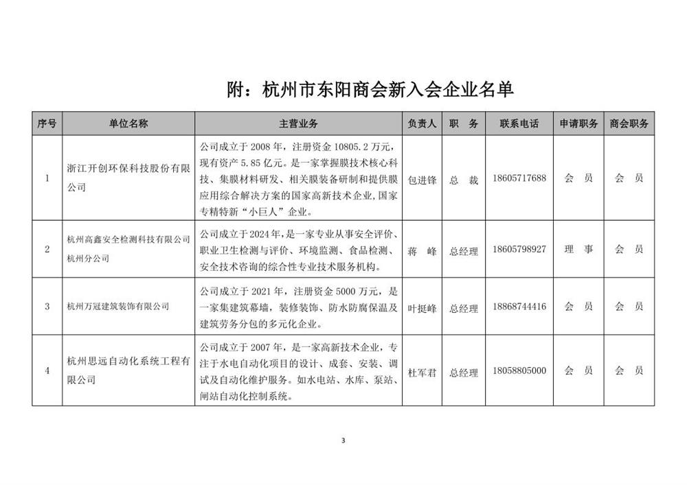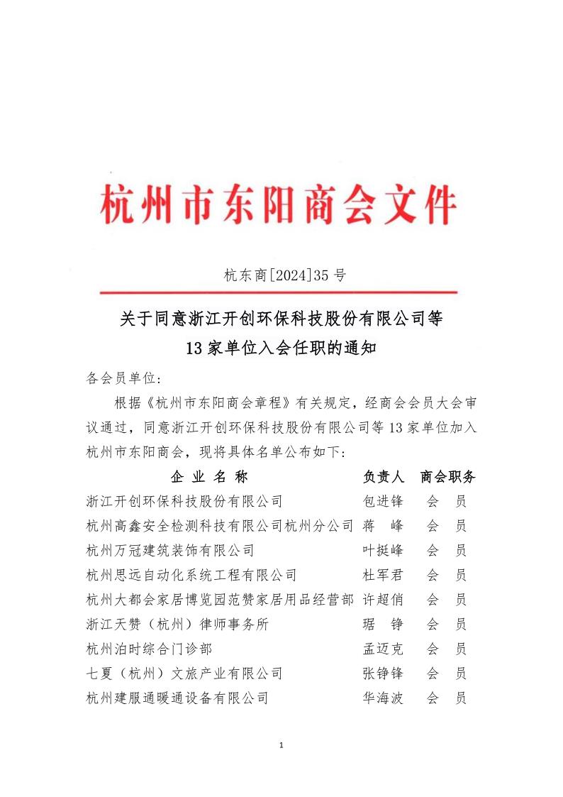 关于同意浙江开创环保科技股份有限公司等 13家单位入会任职的通知
