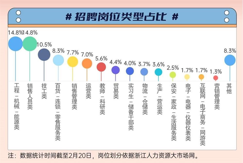 与参与企业相对应,杭州这次的17场招聘活动囊括约15大类的岗位,既有上述这些科研类岗位,也有运营、营销管理等热门岗位。整体来看,销售以及工程类岗位的需求最高,“销售人员类”“销售管理类”合计占比22.5%,“工程/机械/能源类”占比14.8%。