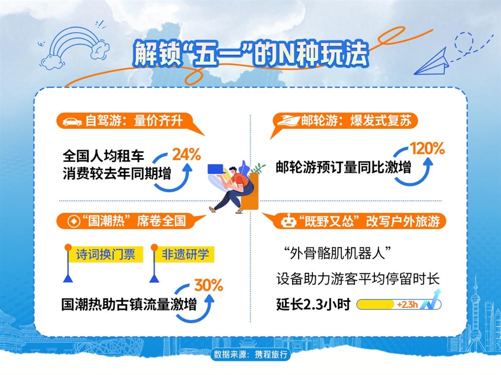国潮演艺类目的地持续领跑,“只有河南·戏剧幻城”、横店影视城、琅琊古城假期演艺类客流排名靠前,中国唐城(襄阳)影视基地五一票量同比翻番。网友戏称,“白天背诗换门票,晚上看剧学历史,仿佛是‘文化特种兵’”。