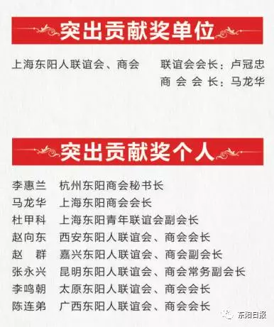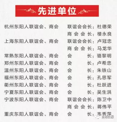 2016年,在市委、市政府的坚强领导和精心指导下,在社会各界的关心支持下,东阳人联谊总会紧紧围绕市委市政府全力打造“影视旅游名城、经济文化强市、生态宜居东阳”建设目标,积极开展各项联谊交流活动,充分调动发挥各地东阳人联谊会、商会和广大会员的积极性,立足本职,建功立业,回报社会,回归家乡,为强市名城“两美”东阳建设作出了积极贡献。据统计,一年来配合相关部门引进签约回归大项目6个,协议资金达100亿元,实际到位资金39.32亿元,存款回归流量96.55亿元,存量达11.9亿元。为鼓励先进,全面提升联谊工作水平,根据各地东阳人联谊会、商会推荐,经东阳人联谊总会研究,决定对如下10个先进单位、1个突出贡献奖单位、8名突出贡献奖个人予以通报表彰: