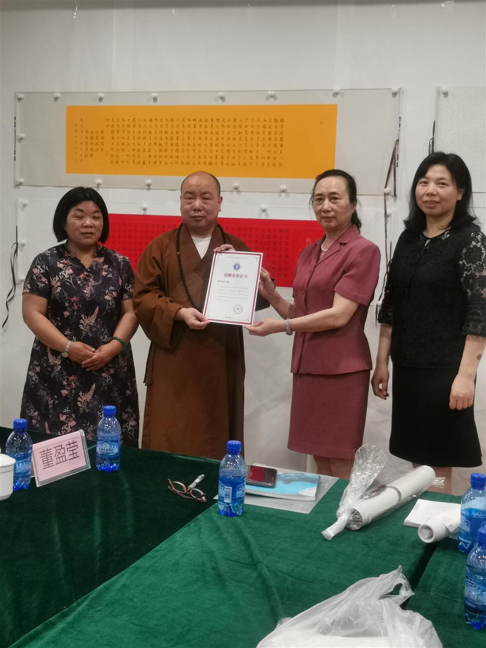 最后,现场给各位参加仪式的单位分别捐赠墨宝,本商会收到昌兴法师的心经和兰花各一副,当场回馈捐赠证书,以致感谢。